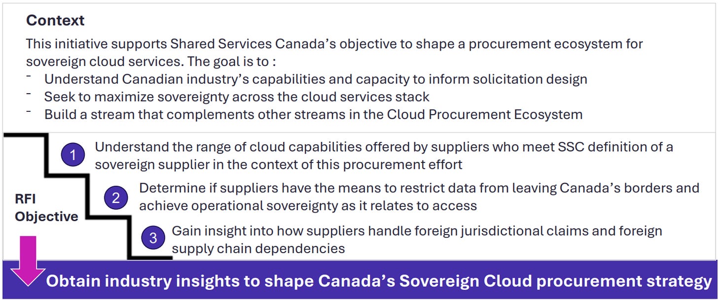 However, the federal government appears poised to address this gap. On March 3, Public Services and Procurement Canada (PSPC) and Shared Services Canada (SSC) updated the Request for Information (RFI) - Sovereign Cloud Capability - Upcoming Competitive Processes with specific, targeted requests for information that should make proponents of Canadian sovereign cloud happy. I have covered a lot of information from last year here, so what’s new and so interesting about the update?