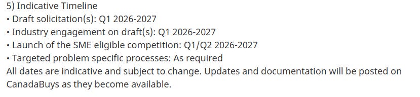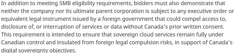 This seems to indicate that there will potentially be contracts where SMBs cannot meet the needs. This may even mean that United States-owned Canadian corporation could compete in these one-offs, but it is unclear what definition they are using for “Canadian firm” here. It likely means the narrow one they have developed to sovereign cloud, but for these one-off contracts it could be more permissible depending on the context.